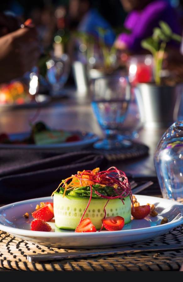 Genießen Sie ein Fünf-Gänge-Menü mit Hähnchenbrust in Kräuterkruste mit Brie-Käse, knusprigem Reiskuchen, Karottenpüree, Zuckerschoten und Erdbeergastrique.
