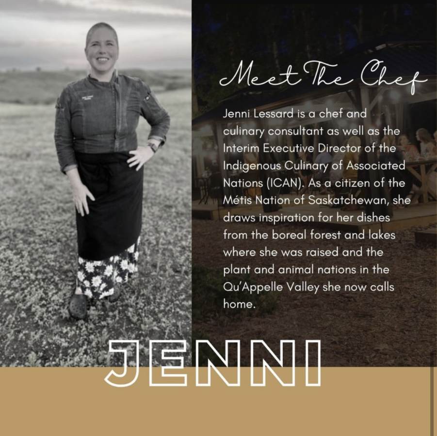 Genießen Sie ein Vier-Gänge-Menü mit Bannock-Kruste vom Bisonkotelett mit Hagebutten-Aioli, Erdbeer- und Krautsalat, Brennnessel- und Knoblauchpüree.