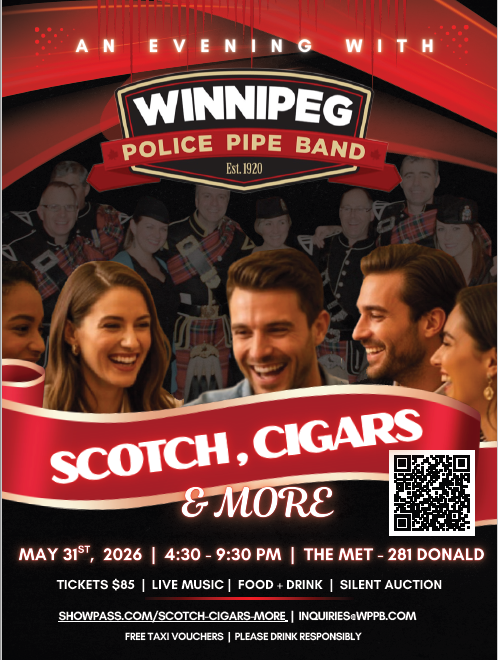Genießen Sie die Musik der Winnipeg Police Pipe Band, Whisky-Verkostungen, eine kostenlose Zigarre, Häppchen, Haggis und Preise bei der stillen Auktion.