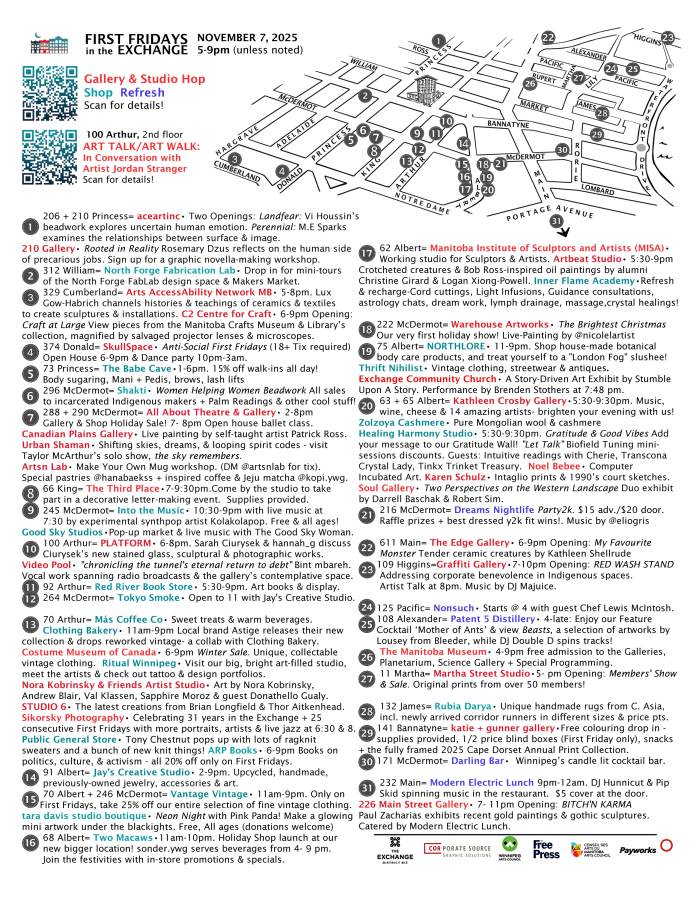 First Fridays in the Exchange bringt Künstler, von Künstlern geführte Zentren, Galerien, Unternehmen und die Öffentlichkeit zusammen, um das Verständnis, die Wertschätzung und die Förderung der Kunst in der florierenden Gemeinde des Exchange District zu verbessern.