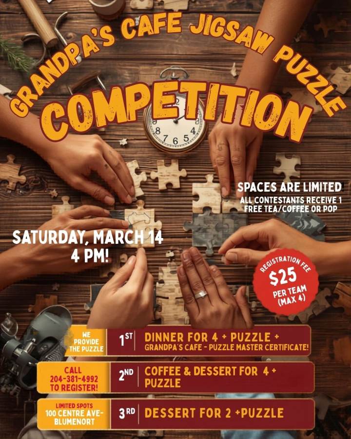 Sind Sie ein schneller Rätsellöser? Grandpa's Cafe in Blumenort fordert Sie heraus, um Preise zu rätseln! Nur noch 10 Plätze frei!!! Anmeldungen unter: 204-381-4992. Wir haben montags bis mittwochs von 8 bis 14 Uhr, donnerstags bis samstags von 8 bis 20 Uhr und sonntags von 10 bis 15 Uhr geöffnet.