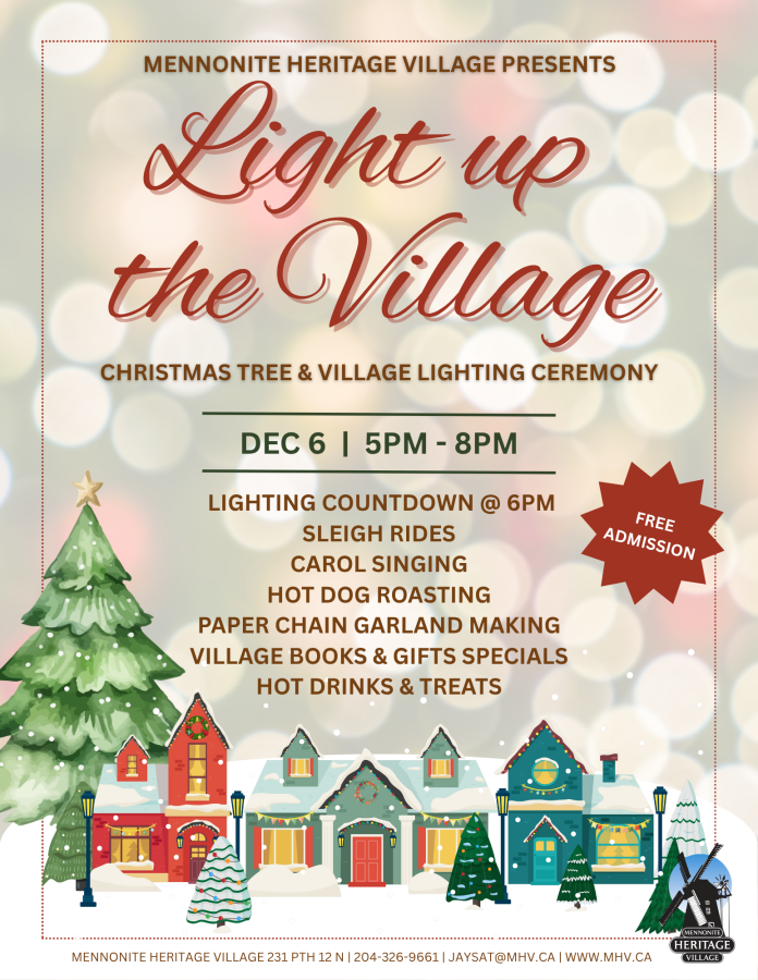 Begleiten Sie MHV zu unserer ersten jährlichen Weihnachtsbaum- und Dorfbeleuchtungszeremonie! Nehmen Sie am Countdown teil und erleben Sie, wie das Dorf mit Tausenden von Weihnachtslichtern erstrahlt. Genießen Sie Weihnachtslieder, das Winter in the Village Café, das Braten von Hot Dogs, das Basteln von Papiergirlanden und Schlittenfahrten in unserem malerischen Dorf. Erleben Sie den Charme eines altmodischen Weihnachtsfestes in unserem historischen Pionierdorf!